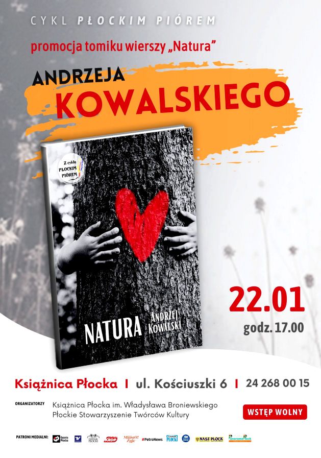 22 stycznia o 17.00 Książnica Płocka i Płockie Stowarzyszenie Twórców Kultury zapraszają na promocję tomiku wierszy „Natura” Andrzeja Kowalskiego wydanego przez Książnicę w cyklu „Płockim piórem”.
